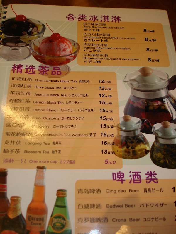 This one is special because it not only has 'crona beer' and 'budwei beer', but if you look at 'tea' (in the middle by the teapots) it has one special tea that would like to suck your blood. If you translate the Chinese, it is still a nobleman's tea, but he happens to usually be considered an earl, not a count. Or court.